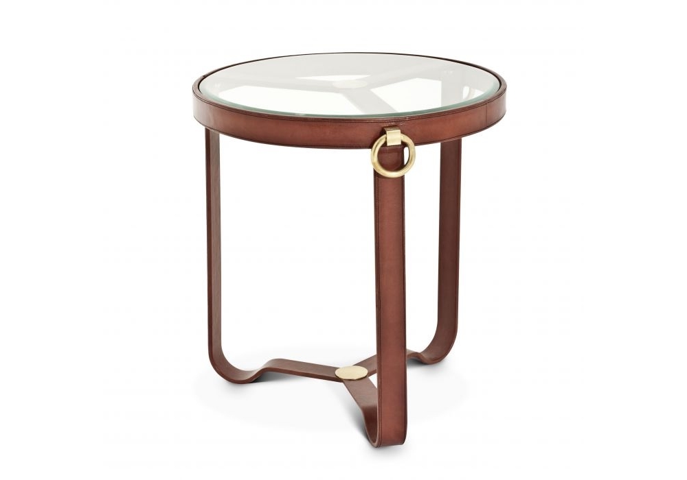 Side Table Belgravia firmata da Eichholtz è un tavolino d'appoggio con struttura rivestita in pelle marrone, presenta ornamenti in ottone anticato e un ripiano in vetro trasparente.