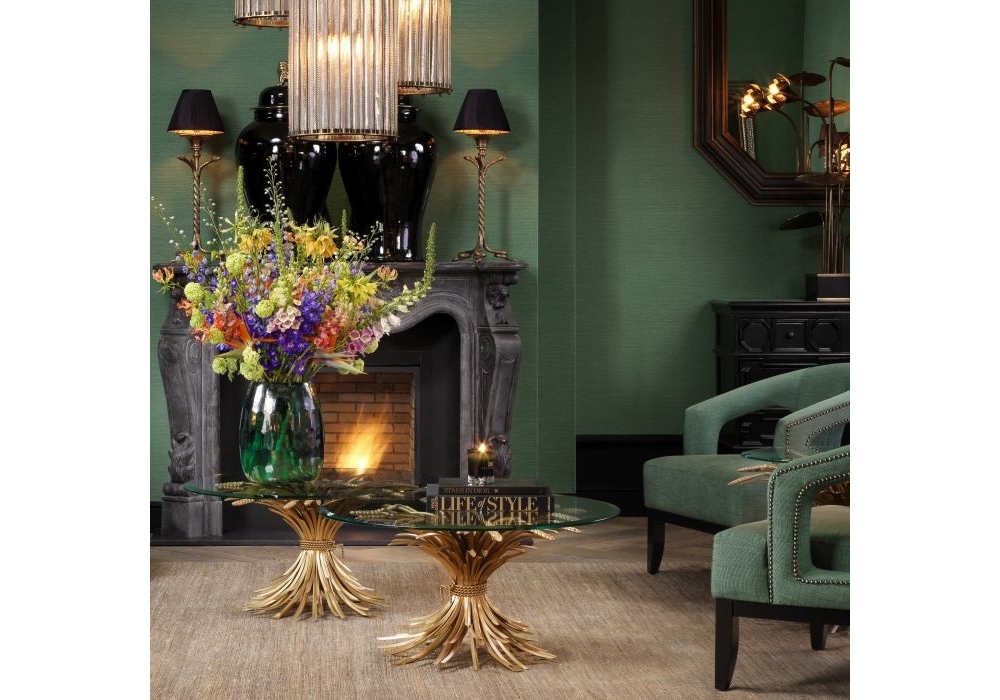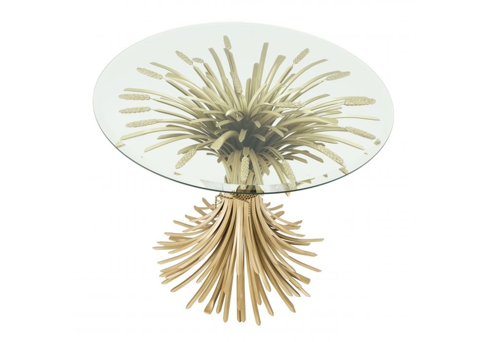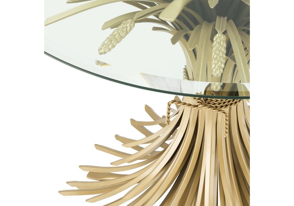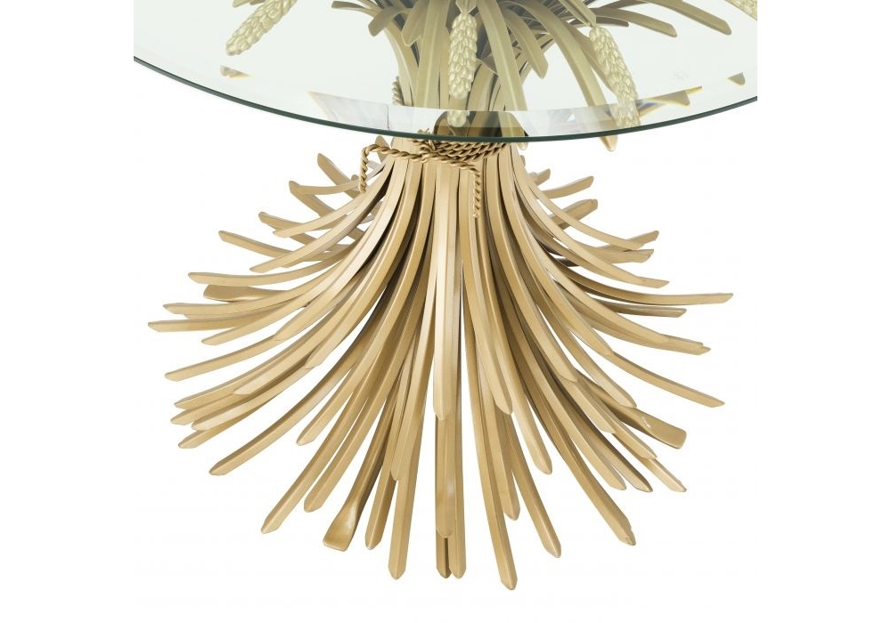 Side Table Bonheur firmato da Eichholtz è un tavolo d'appoggio Lavorato in ferro con una finitura in oro anticato, comprende una base a forma di fastello di erba e spighe e un top in vetro trasparente smussato. Disponibile in diverse dimensioni.