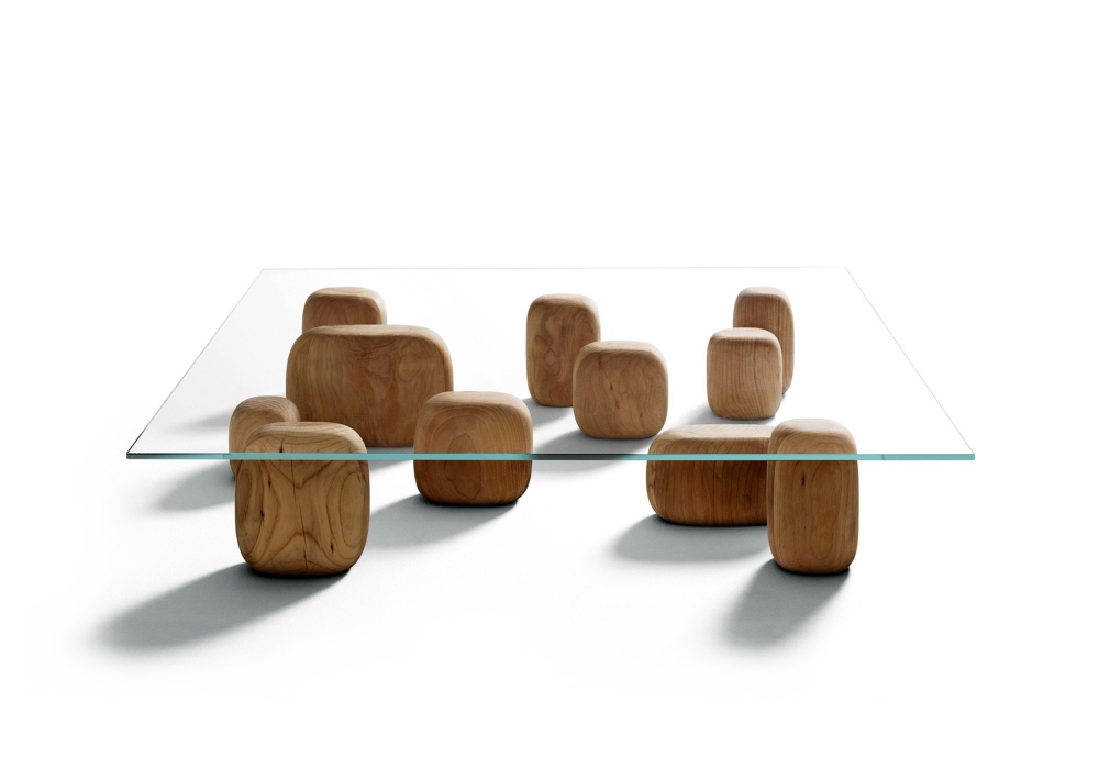 Ishi firmato da Nendo per DePadova è un tavolino con base realizzata in massello di cedro del Libano e piano in vetro temperato extrachiaro.