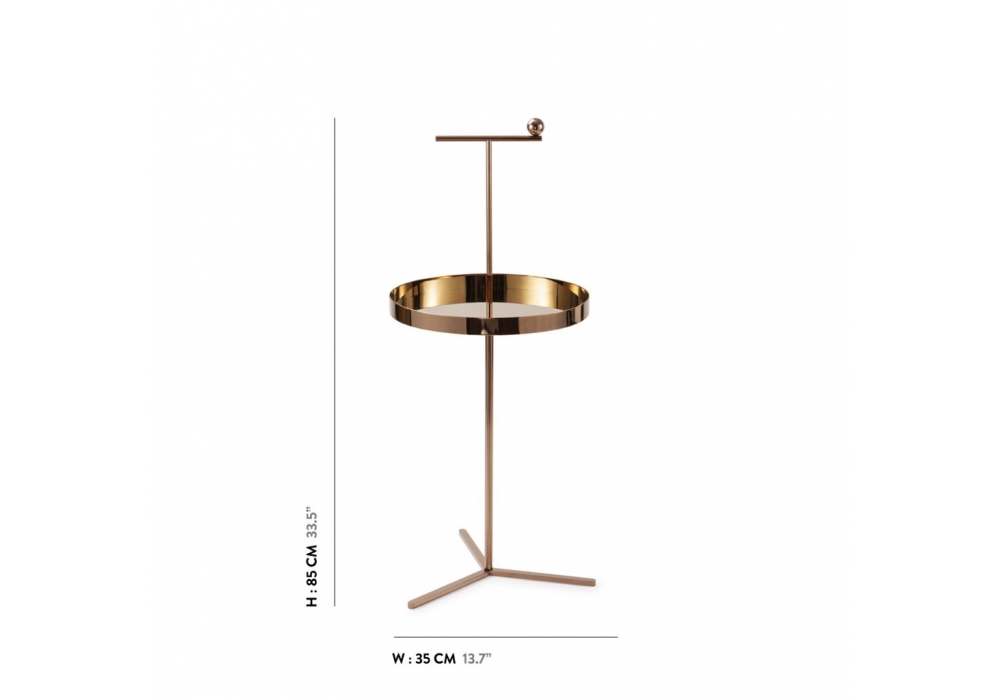 Off The Moon N°4 firmato da Thomas Dariel per Maison Dada è un tavolino d'appoggio con top di forma circolare e base a tre piedi tubolare in metallo placato rame lucido.