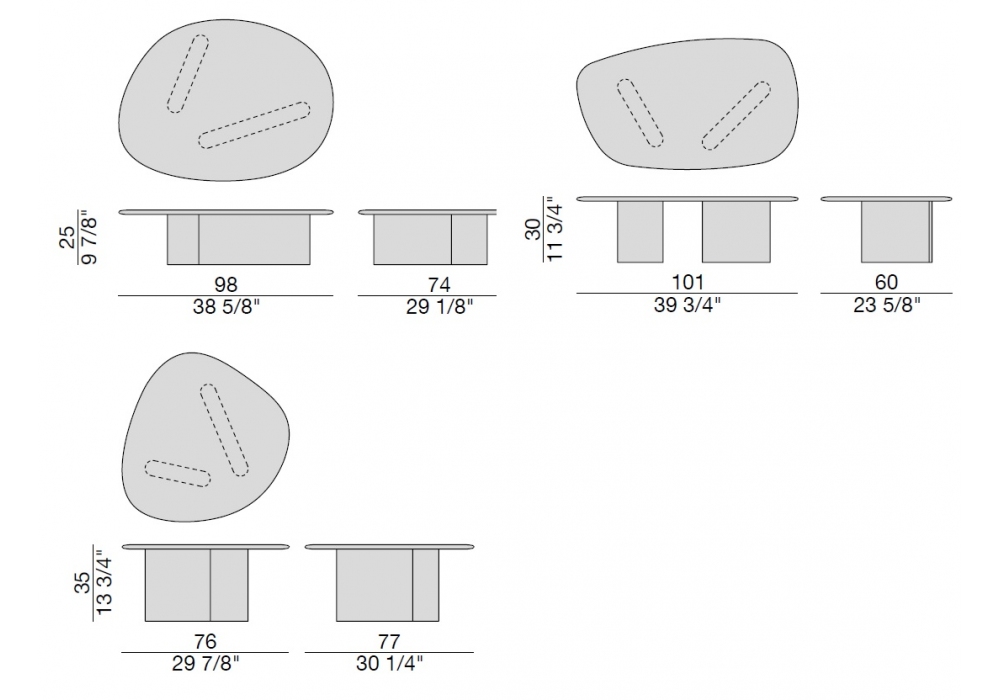 | Dimensioni | • 98 x 74 x H 25 cm; • 101 x 60 x H 30 cm; • 76 x 77 x H 35 cm |