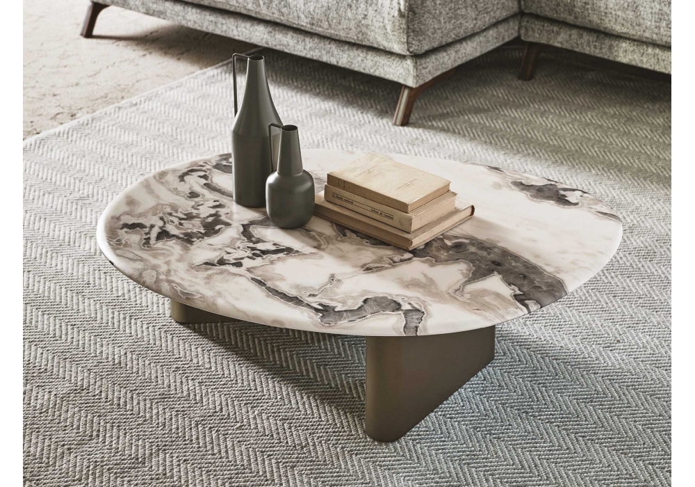 Callisto firmato da Carlo Ballabio per Porada è un tavolino realizzato con base in legno laccato opaco poro chiuso finitura Bronzoro e piano in marmo. Disponibile in diverse dimensioni.
