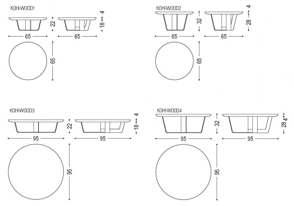| Dimensioni | Ø 65 x H 22 cm; Ø 65 x H 32 cm; Ø 95 x H 22 cm; Ø 95 x H 32 cm. |