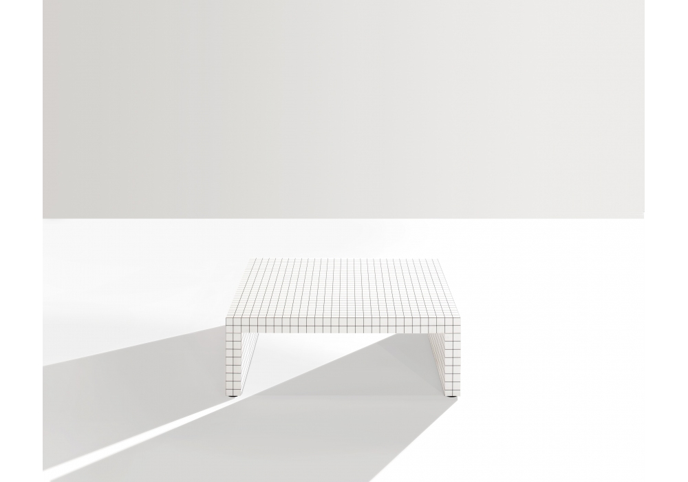 656 Quaderna firmato da Superstudio / Cristiano Toraldo di Francia per Zanotta è un tavolino realizzato con struttura in legno tamburato placcato laminato Print, colore bianco, a stampa digitale a quadretti.