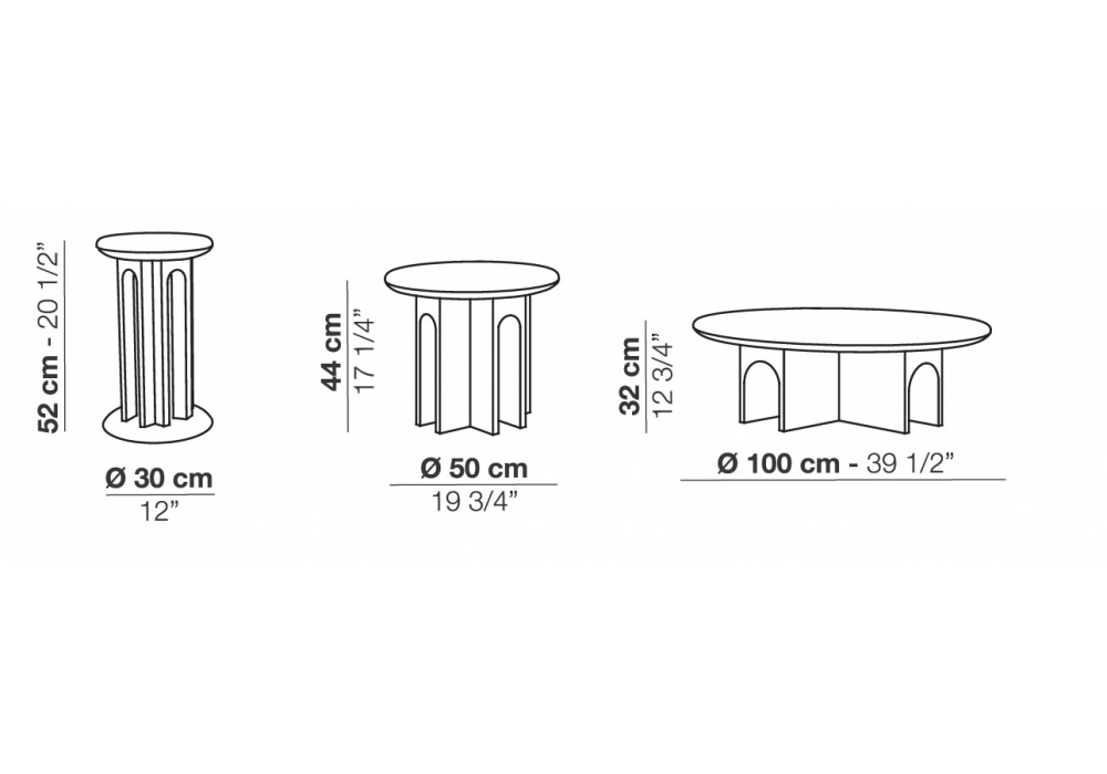 | Dimensioni | Ø 30 x H 52 cm; Ø 50 x H 44 cm; Ø 100 x H 32 cm. |