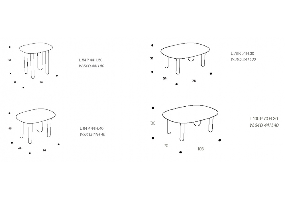 | Dimensioni | 54 x 44 x H 50 cm; 64 x 44 x H 40 cm; 78 x 54 x H 30 cm; 105 x 70 x H 30 cm. |