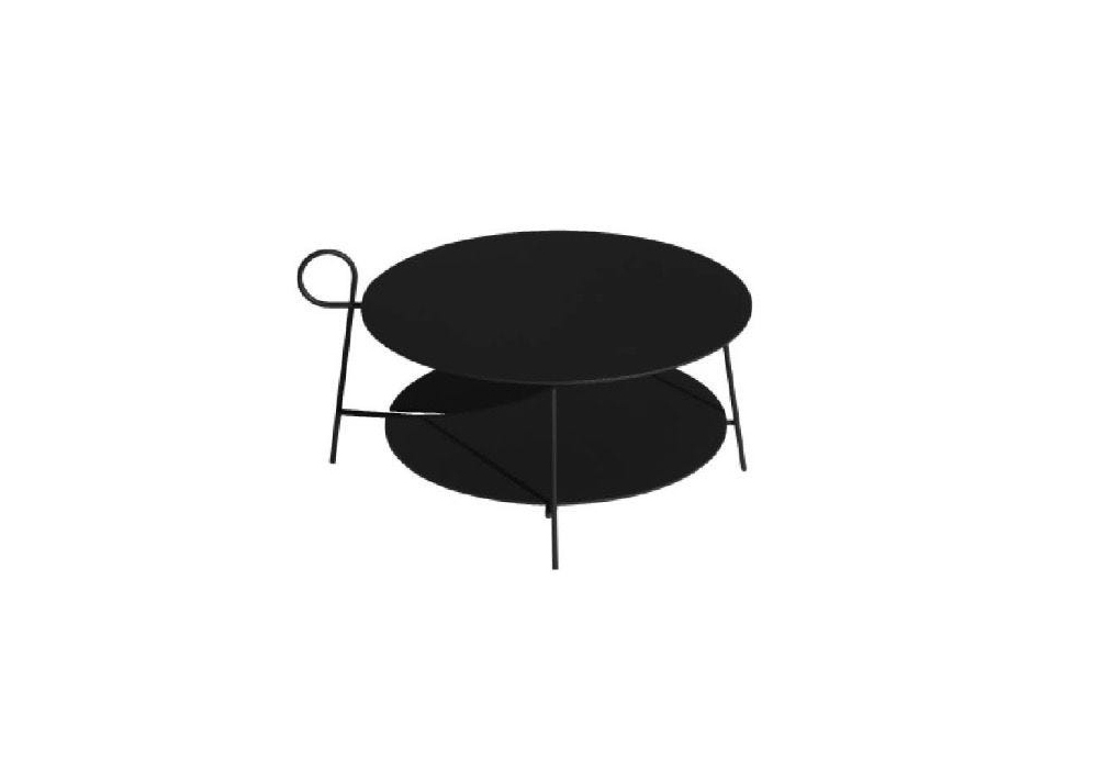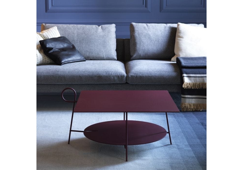 Carmina firmato da Fredrikson Stallard per Driade è un tavolino con struttura in tondino di acciaio e piani in lamiera di alluminio verniciato a polvere poliestere, nei colori: nude, sabbia, nero o bordeaux.