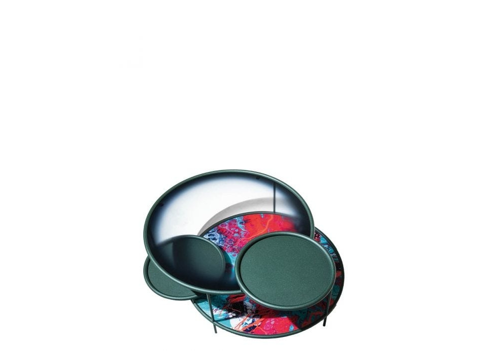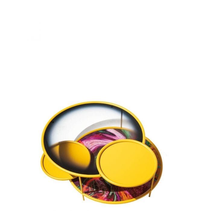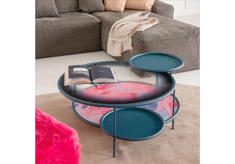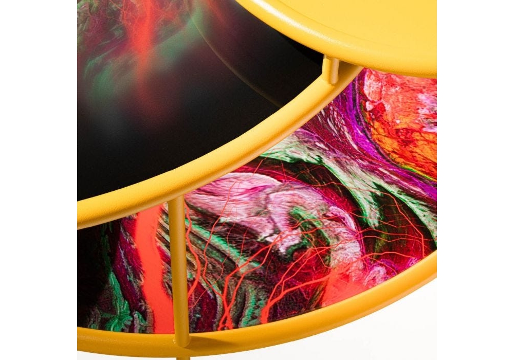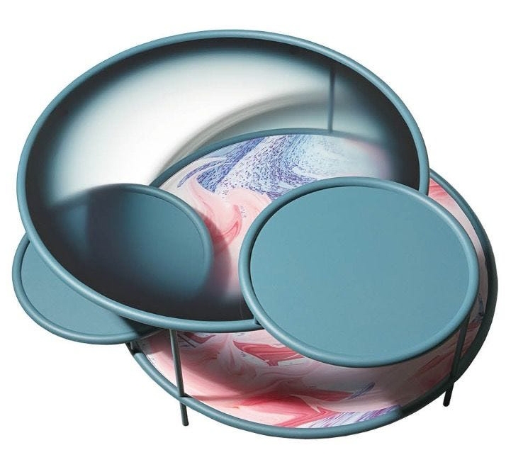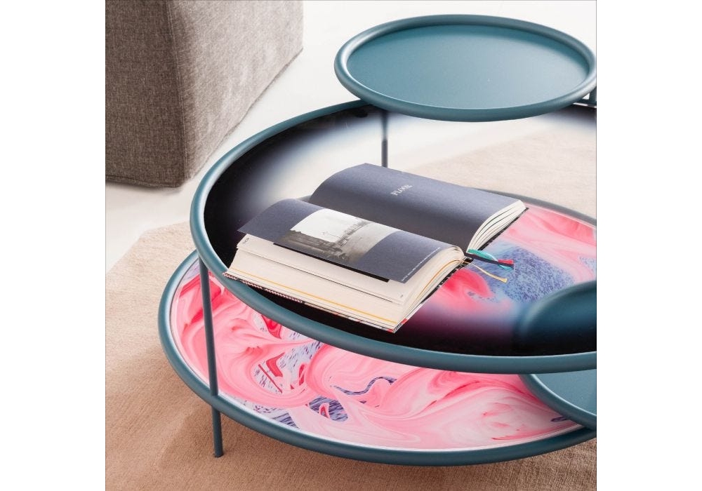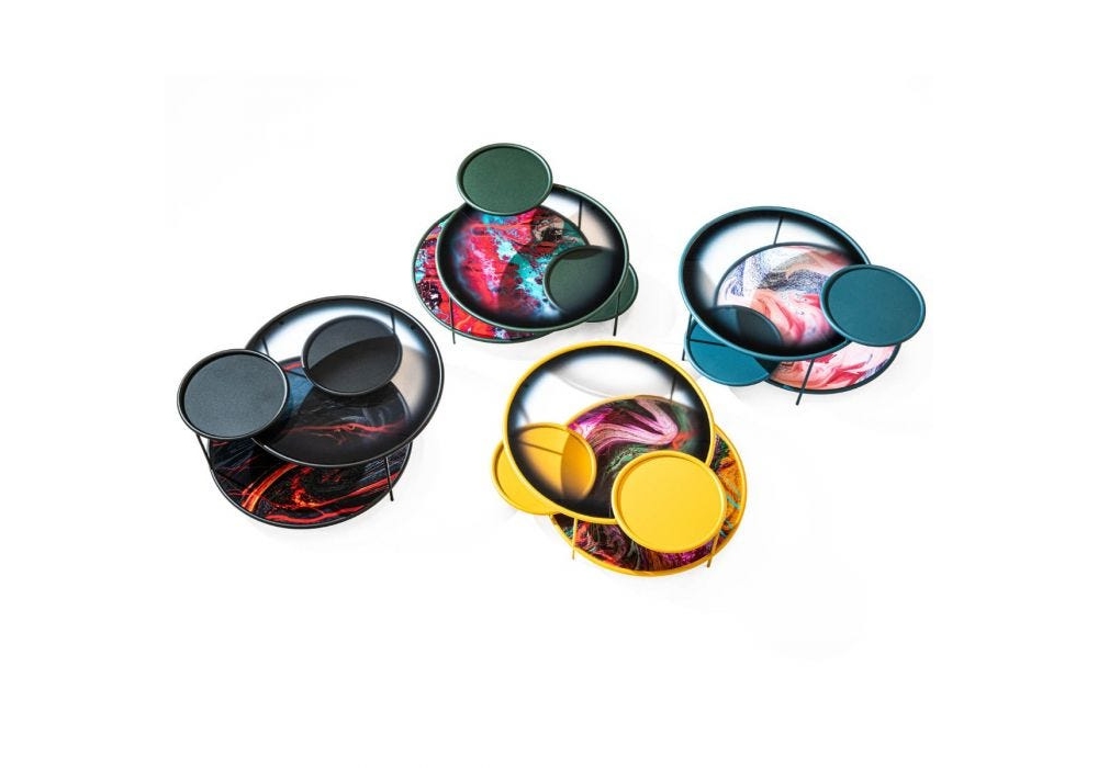Sangaku firmato da Elena Salmistraro per Driade è un tavolino con quattro piani circolari sovrapposti tra loro, struttura in tubo di acciaio verniciato a polvere poliestere in quattro colori. Piani diametro 42 cm. in acciaio, piani diametro 82 cm. in vetro decorato e vetro con bordo sfumato. Uso solo interno.