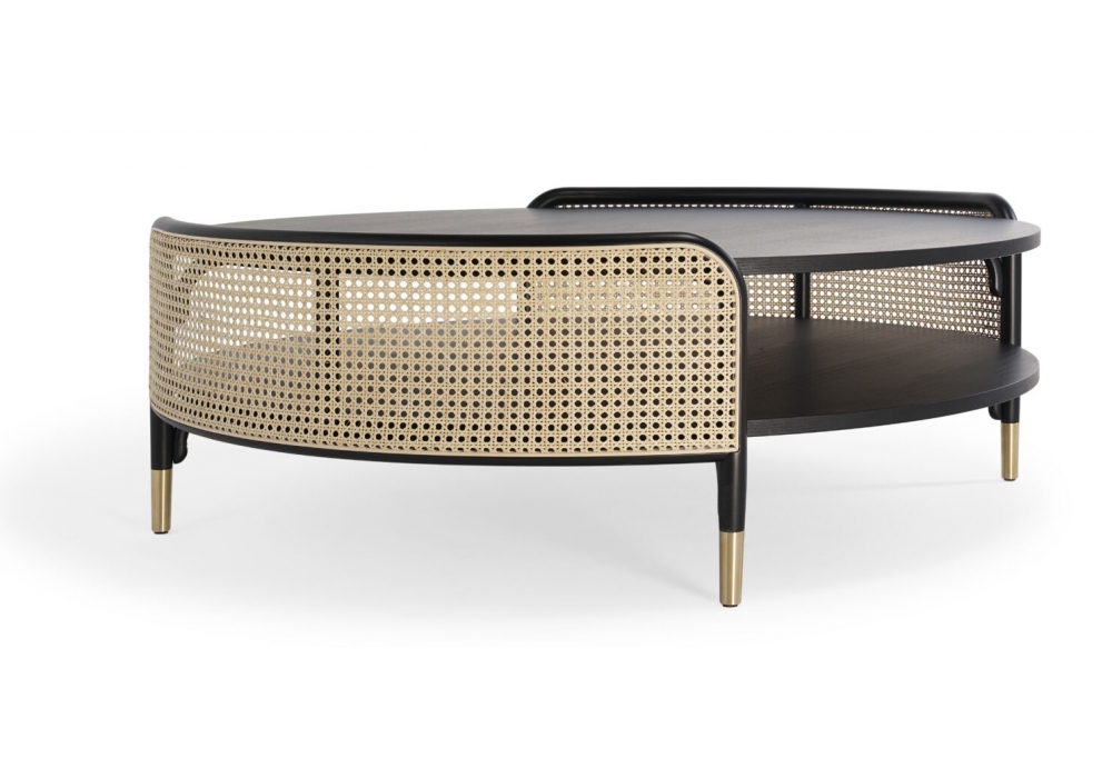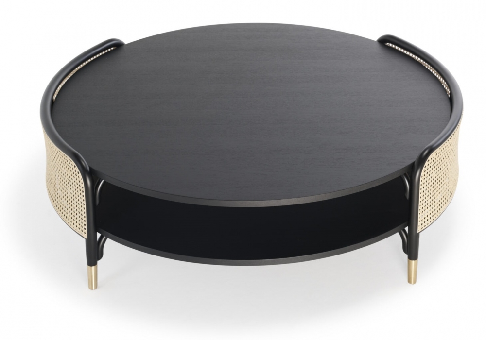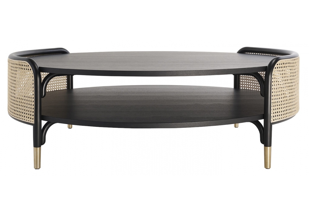 Detour firmato da Gamfratesi per Gebrüder Thonet Vienna è un tavolino con struttura in faggio curvato, ripiani in frassino e inserti in paglia di Vienna. Puntali in ottone.