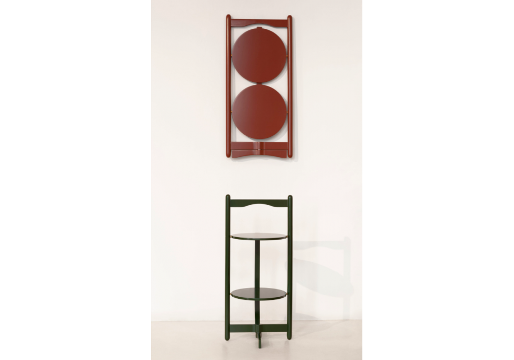 Florian firmato da Vico Magistretti per Acerbis è un tavolino a due piani pieghevole con struttura portante in legno massello sostenuto da cerniere e perni in ottone spazzolato naturale, disponibile in differenti finiture.