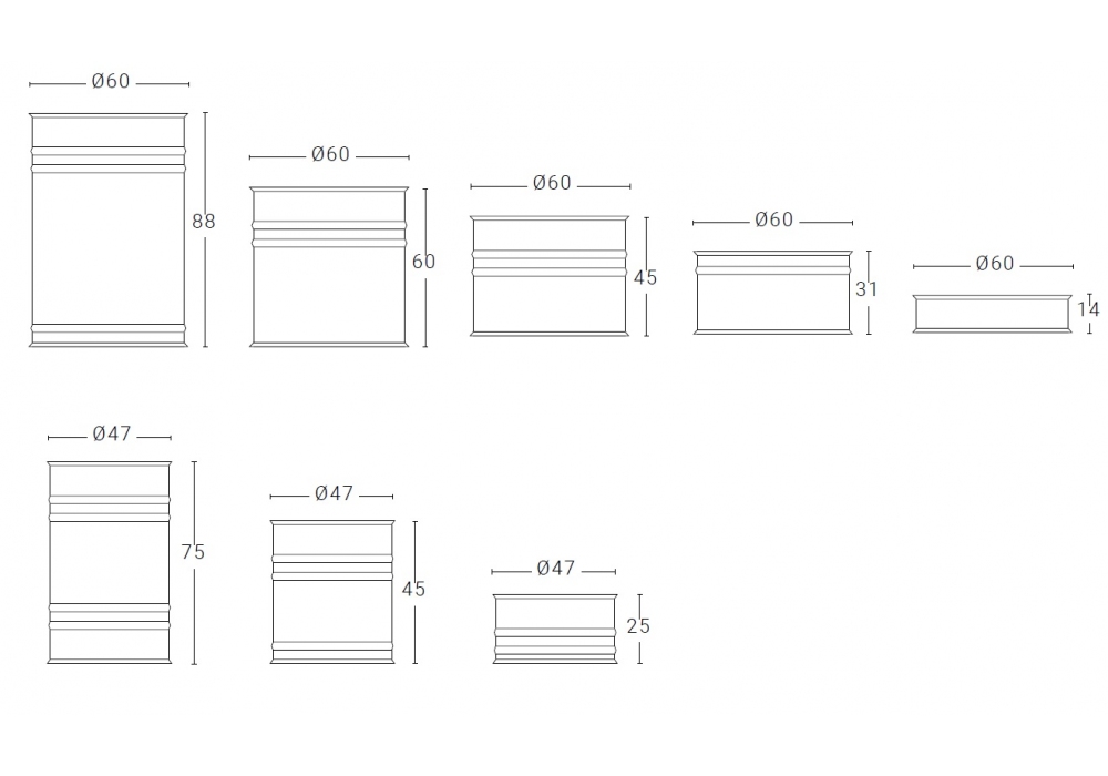 | Dimensioni | Ø 60 x H 88 cm; Ø 60 x H 60 cm; Ø 60 x H 45 cm; Ø 60 x H 31 cm; Ø 60 x H 14 cm; Ø 47 x H 75 cm; Ø 47 x H 45 cm; Ø 47 x H 25 cm. |