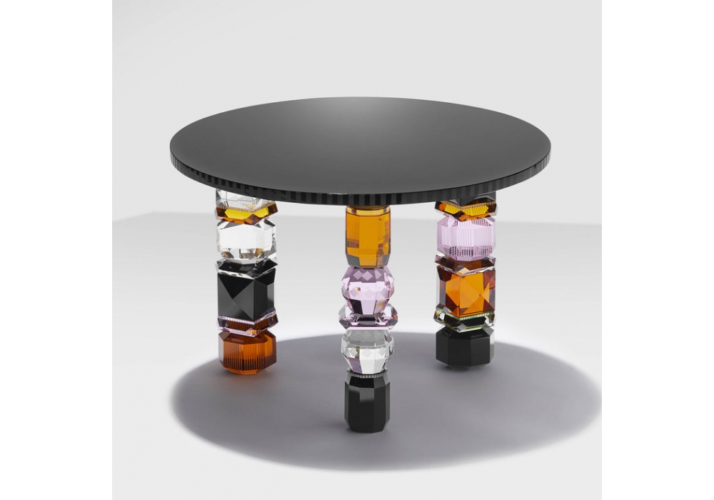 Orlando prodotto e firmato da Reflections Copenhagen è un tavolino di forma circolare in cristallo strutturato da vari elementi geometrici intagliati e rifiniti a mano verniciato multi colore.