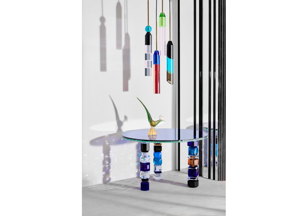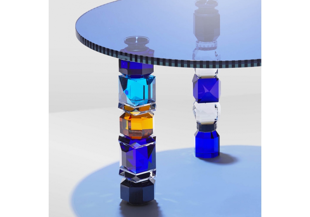 Detroit prodotto e firmato da Reflections Copenhagen è un tavolino di forma circolare in cristallo strutturato da vari elementi geometrici intagliati e rifiniti a mano verniciati multi colore.