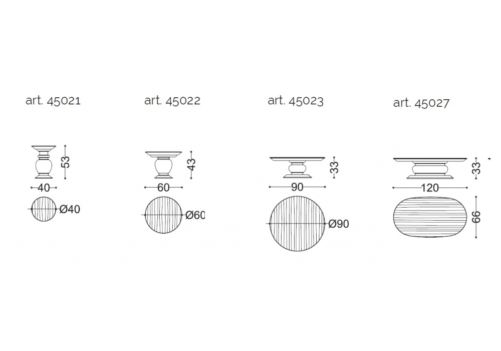 | Dimensioni | Ø 40 x H 53 cm; Ø 60 x H 43 cm; Ø 90 x H 33 cm; 120 x 66 x H 33 cm. |