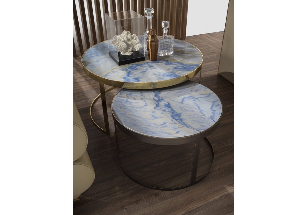 Bis firmato da AL1 per Longhi è un tavolino con struttura in metallo rettificato tagliato al laser con finitura lucida o opaca e piano in specchio, onice o marmo. Disponibile in differenti dimensioni.