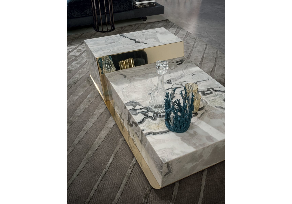 Bold firmato da Giusepe Iasparra per Longhi è un tavolino composto da due elemtenti con altezze diverse e profili in metallo lucido o opaco. Disponibile in differenti finiture.