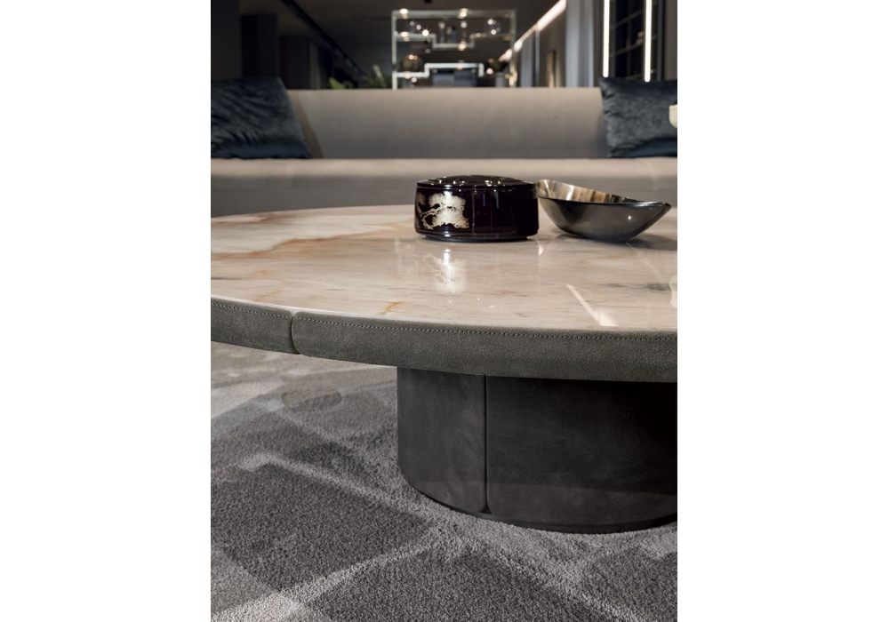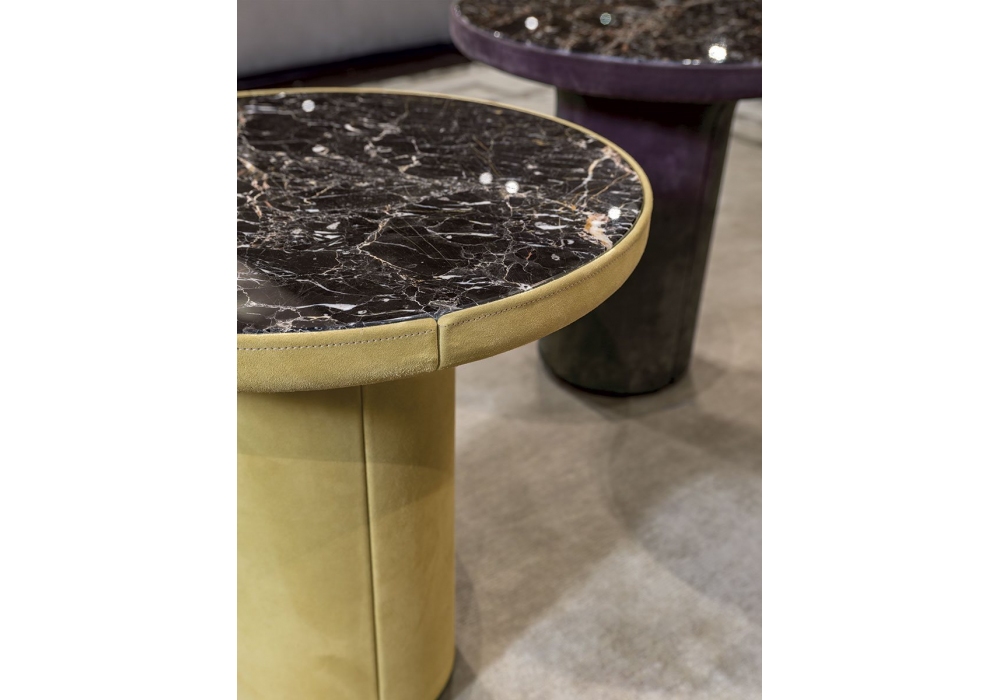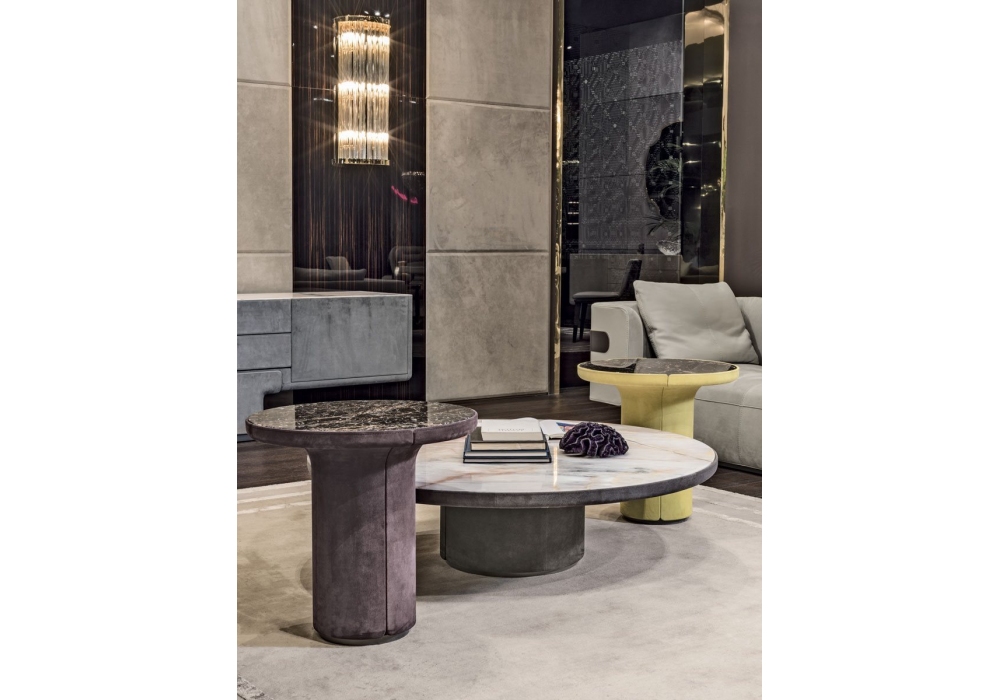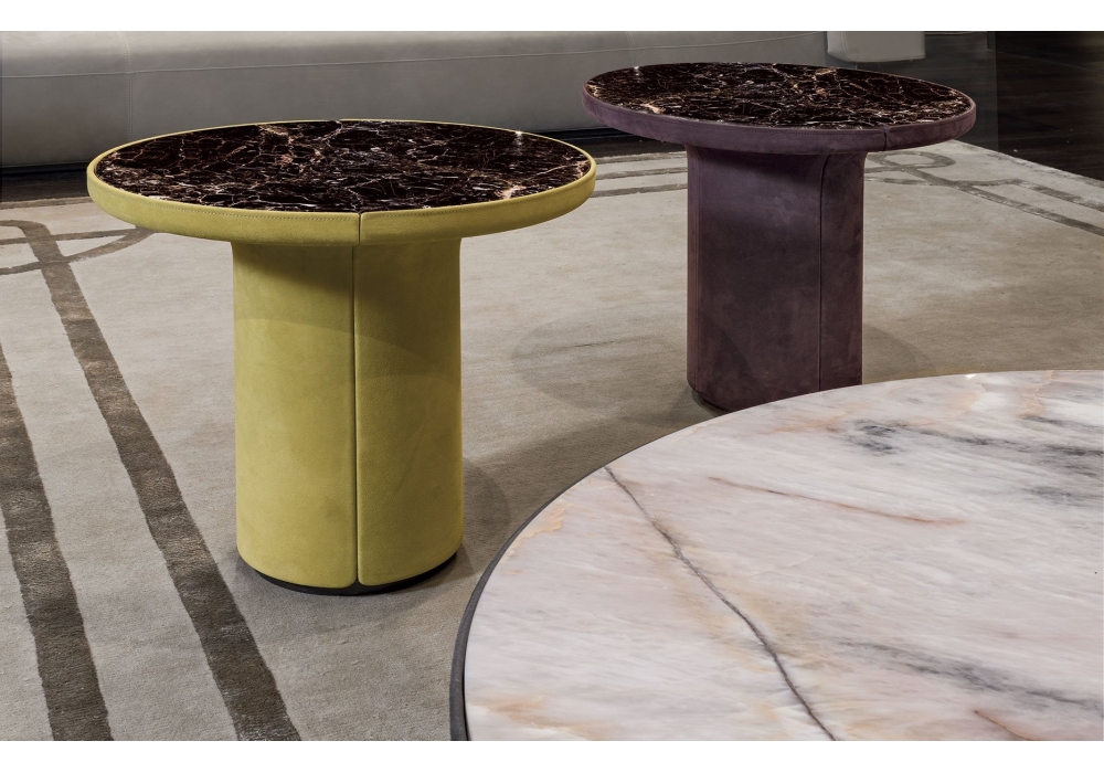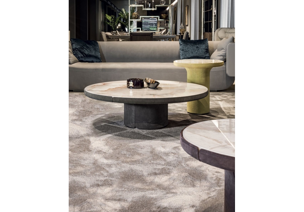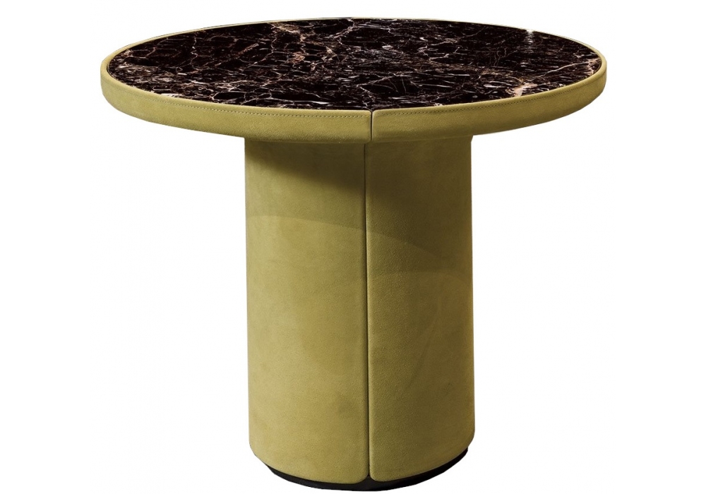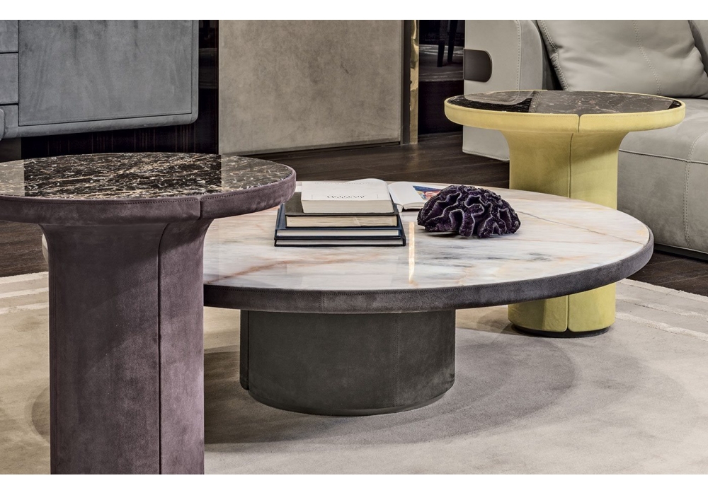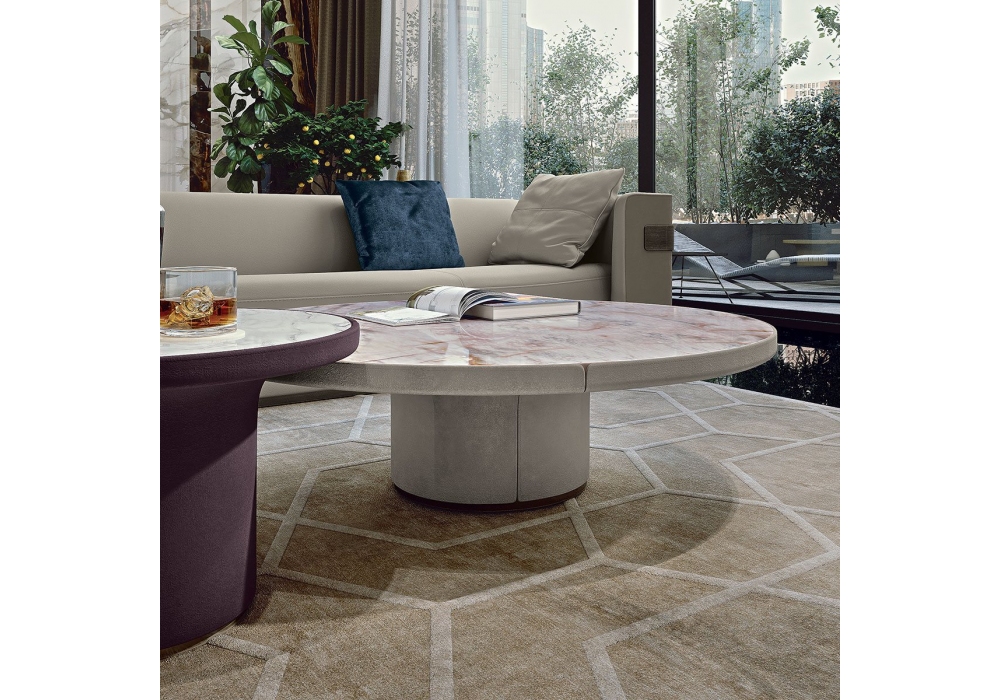 Re firmato da Ben Wu per Longhi è un tavolino rotondo con struttura interna in metallo verniciato e scocca in vetroresina a stampo manuale con rivestimento in pelle. Base in metallo rettificato lucido o opaco e piano in marmo, specchio, onice o legno con lavorazione a "spicchi" con intarsio in essenza. Disponibile in differenti dimensioni.