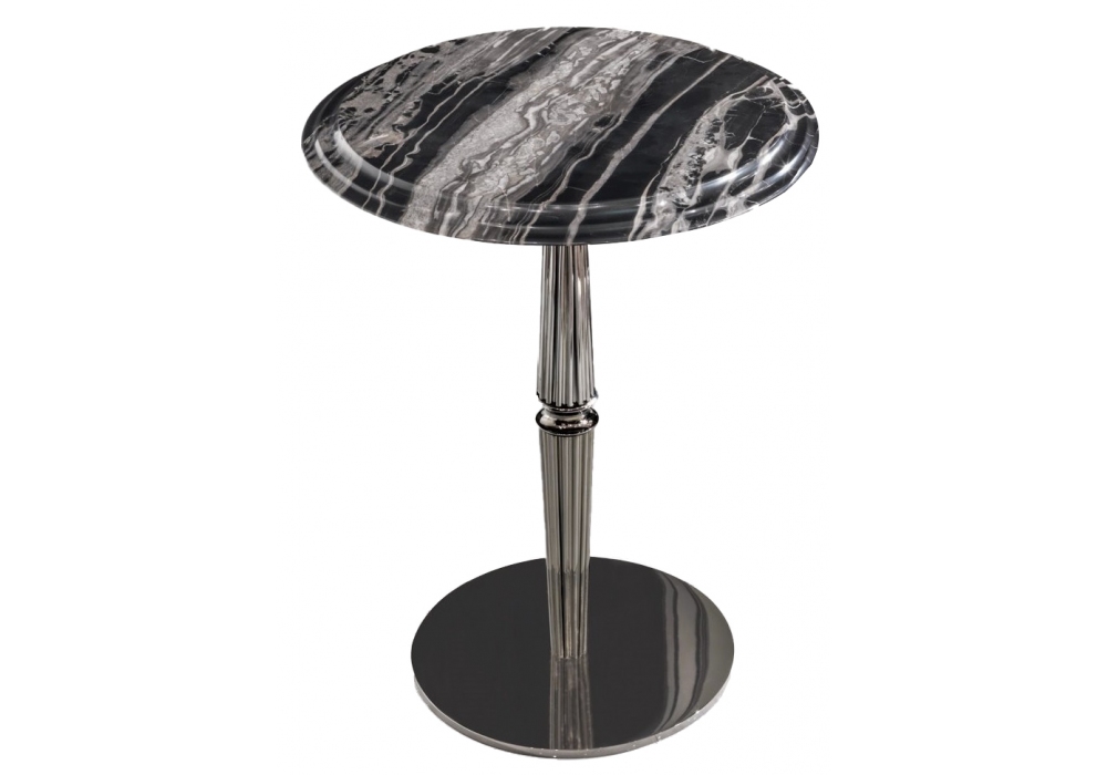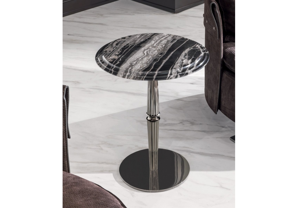 Gueridon Marble firmato da Giuseppe Iasparra per Loghi è un tavolino d' appoggio con piano in marmo e struttura in metallo lucido o opaco. Su richiesta è disponibile la versione con colonna rivestita in pelle e/o con anello tornito in metallo come la base.