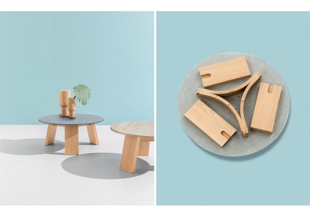 Maya firmato da Lars Beller Fjetland per Discipline è un tavolino con piano in pietra Serena, travertino Navona o Materia. Gambe in frassino naturale o tinto nero.