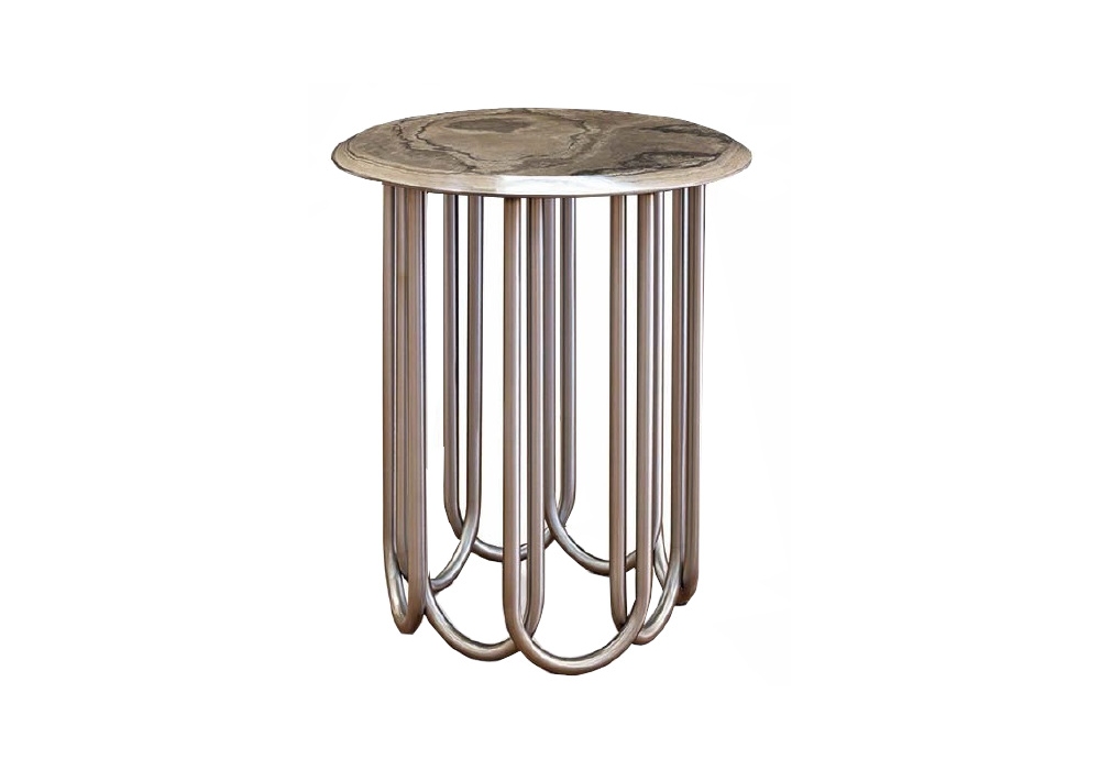 Audrey firmato da Andrea Bonini per Turri è un tavolino d'appoggio con struttura in metallo e piano in MDF decorato a mano in finitura poliestere lucido o marmo.