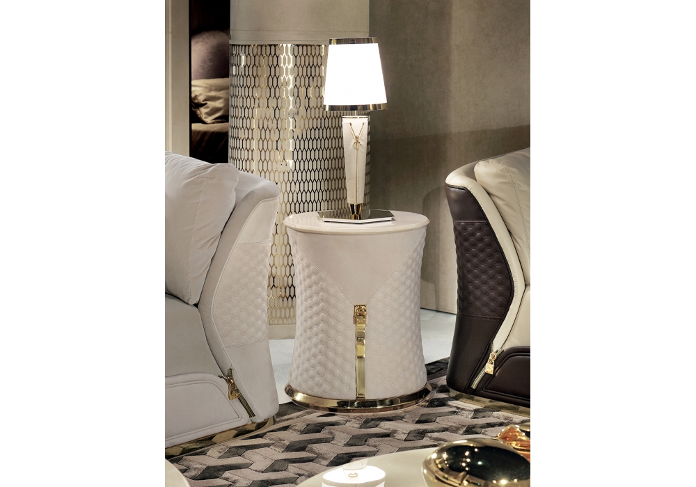 Vogue firmato da Andrea Bonini per Turri è un tavolino d'appoggio con struttura in legno massello e multistrato, rivestimento struttura in pelle o tessuto con ricamo e piano in marmo o legno. Dettagli in metallo in finitura oro.