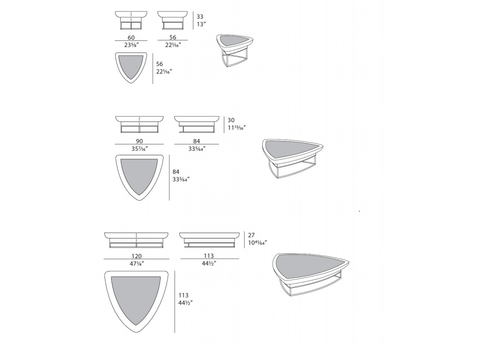 | Dimensioni | 60 x 56 x H 33 cm; 90 x 84 x H 30 cm; 120 x 113 x H 27 cm. |