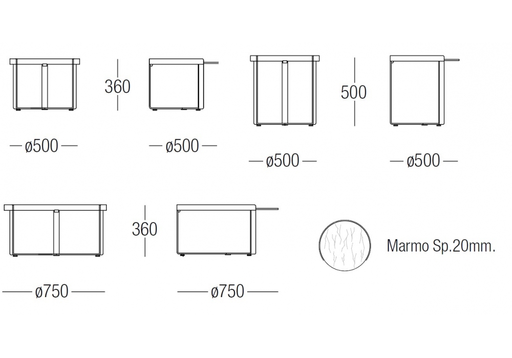 | Dimensioni | Ø 50 x H 36 cm; Ø 50 x H 50 cm; Ø 75 x H 36 cm. |