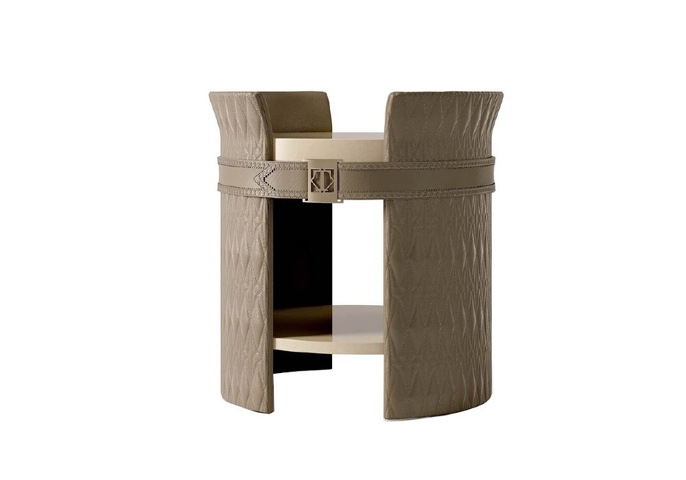 Numero Tre firmato da Roberto Serio per Turri è un tavolino d'appoggio rotondo con struttura in MDF, legno massello, multistrato e pannelli di particelle di legno in finitura poliestere lucido decorato a mano. Rivestimento in pelle ricamata e piano in marmo o legno.