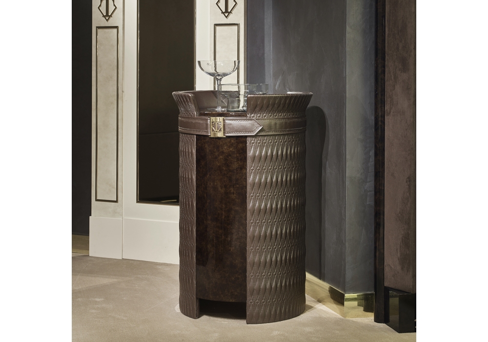 Numero Tre firmata da Roberto Serio per Turri è una colonna con struttura in MDF, legno massello, multistrato e pannelli di particelle di legno in finitura poliestere lucido decorato a mano. Rivestimento in pelle ricamata e piano in marmo o legno.