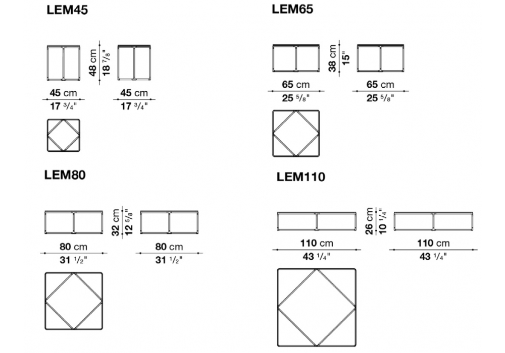 | Dimensioni | 45 x 45 x H 48 cm; 65 x 65 x H 38 cm; 80 x 80 x H 32 cm; 110 x 110 x H 26 cm. |