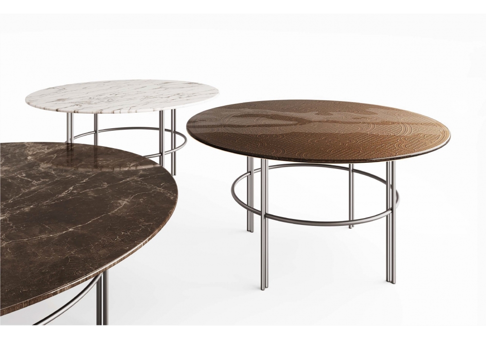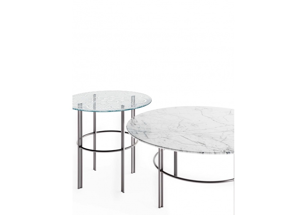 Cristaline firmato da Marcel Wanders Studio per Fiam è un tavolino con piano in vetro fuso a gran fuoco e temperato, disponibile trasparente o retroverniciato con tinte metallizzate. Piano disponibile anche in marmo. Base in metallo finitura Titanio opaco oppure Nichel Nero lucido.
