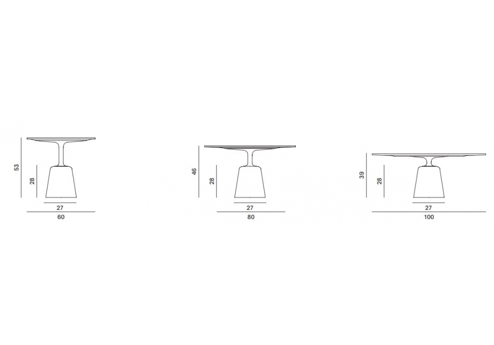 | Dimensioni | Ø 60 x H 53 cm; Ø 80 x H 46 cm; Ø 100 x H 39 cm. |