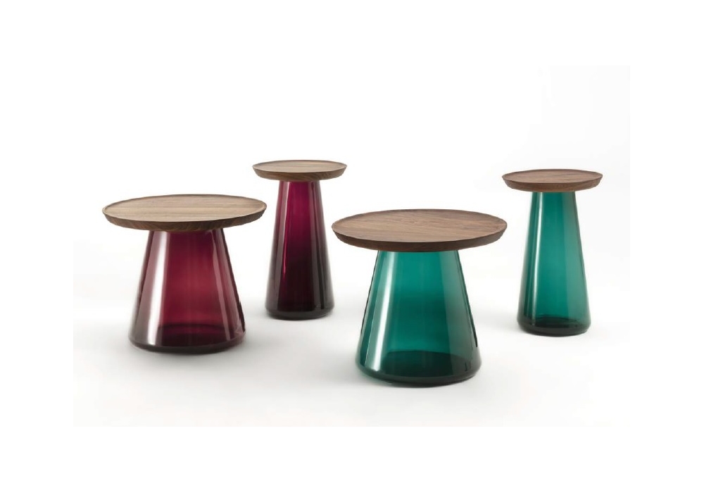 Jigger firmato da Carlo Ballabio per Porada è un tavolino con base in vetro soffiato e piano in massello di noce canaletta o frassino. Disponibile in diverse finiture.