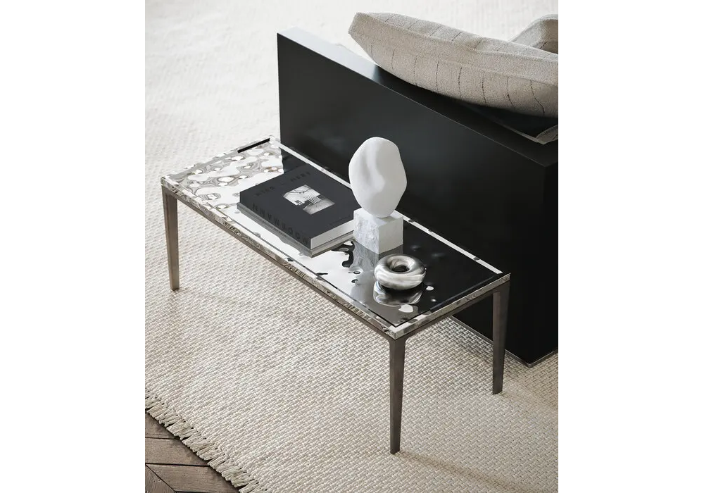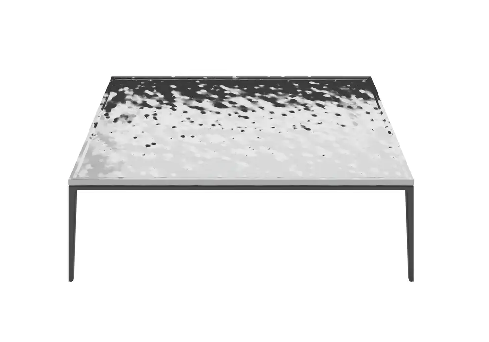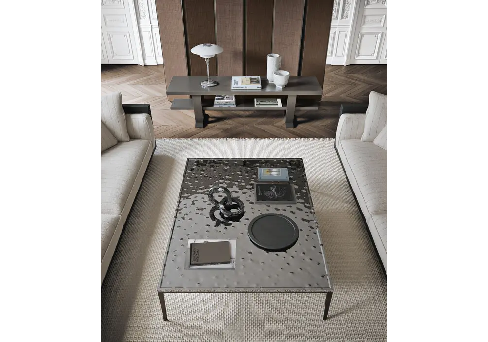 Soleide firmato da Antonio Citterio per Maxalto è un tavolino realizzato con piano in acciaio specchiante martellato color peltro e struttura verniciata in differenti finiture.
