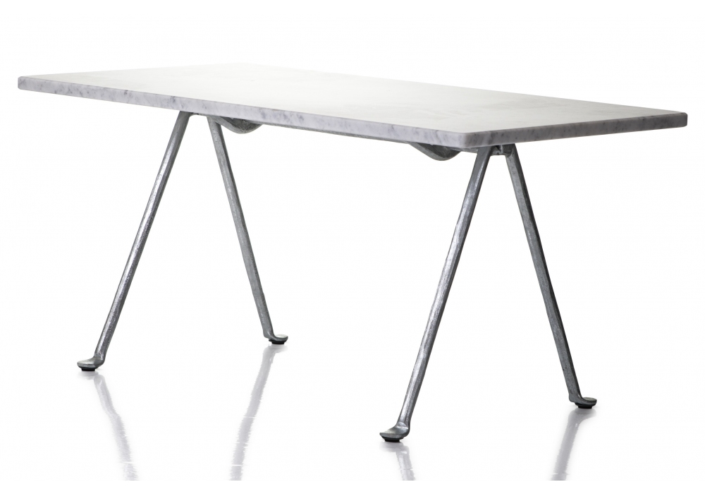 Officina firmato da Ronan & Erwan Bouroullec per Magis è un tavolino con struttura in ferro forgiato, zincato a caldo o trattato cataforesi e verniciato poliestere. Piano in marmo di Carrara bianco o in massello di noce americana.
