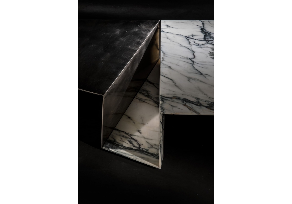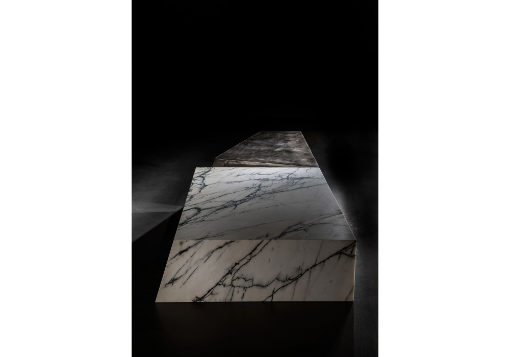 Origami firmato da Ugo Cacciatori per Henge è un tavolino basso artigianale e rifinito a mano, composto da due moduli in due diverse tipologie di finiture: pietra e metallo. Disponibile in diverse dimensioni.