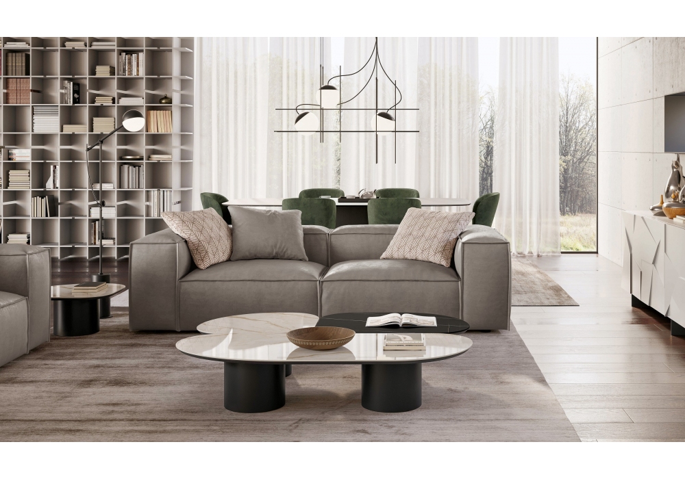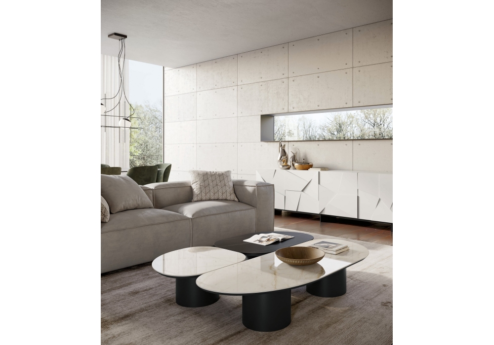 Atollo firmato da Matteo Zorzenoni per Dall'Agnese è un tavolino realizzato con piano sagomato in legno oppure in Gres accoppiato a un pannello di legno laccato opaco nero. Basamento in metallo. Disponibile in diverse finiture e dimensioni.