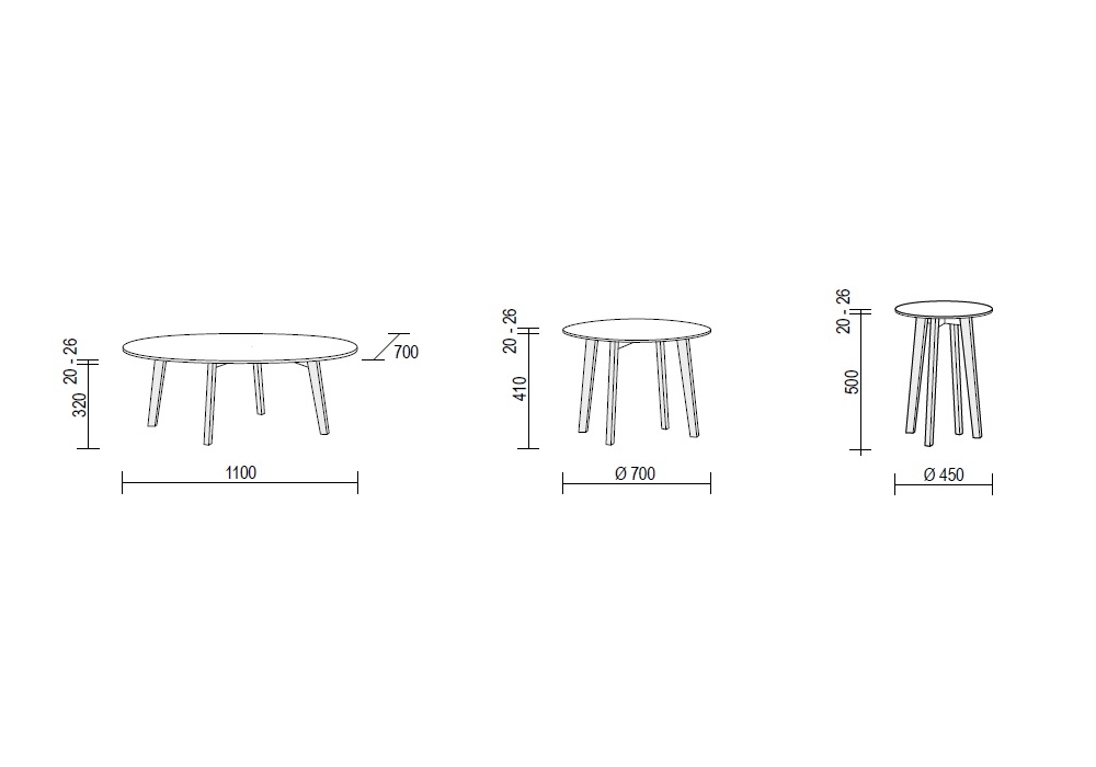 | Dimensioni | Large_ 110 x 70 x H 34/34.6 cm; Medium_ Ø 70 x H 43/43.6 cm; Small_ Ø 45 x H 52/52.6 cm. |
