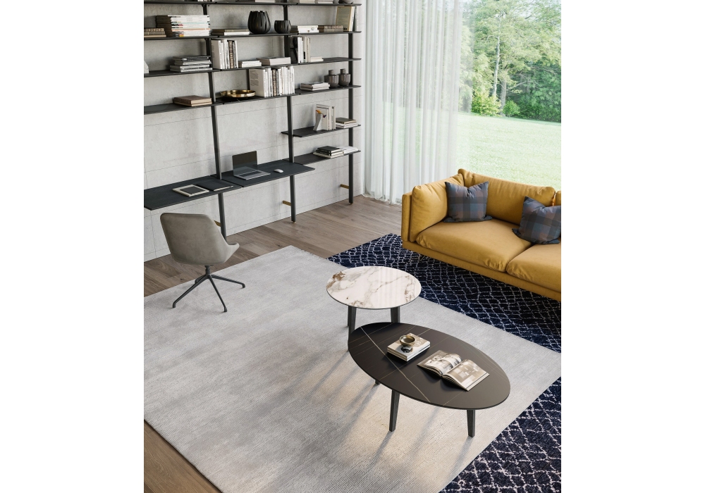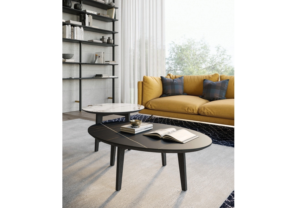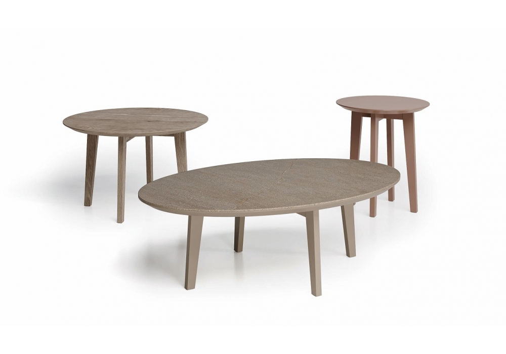 Zoe firmato da Dall'Agnese è un tavolino con piano in legno con bordo perimetrale inclinato 30°. Disponibile anche con piano in Gres accoppiato al piano in legno. Basamento in legno essenza o laccato opaco.