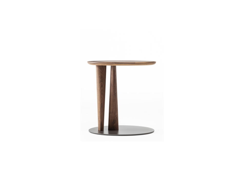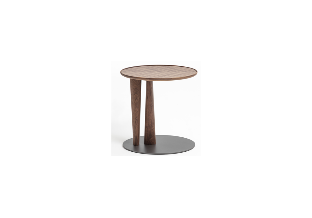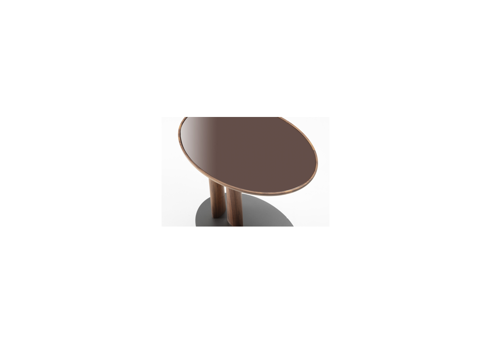 Côté firmato da Gabriele & Oscar Buratti per Porada è un tavolino d'appoggio con base metallica dalla forma ovale in finitura grigio peltro. Montanti e cornice sono invece realizzati in legno massello di noce canaletta. Il piano è disponibile in legno intarsiato con motivo "chevron", Cuoietto, Rock oppure laccato lucido in differenti finiture.