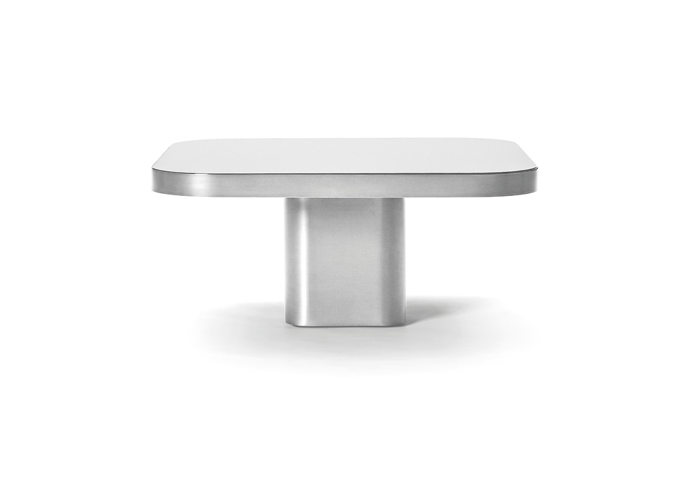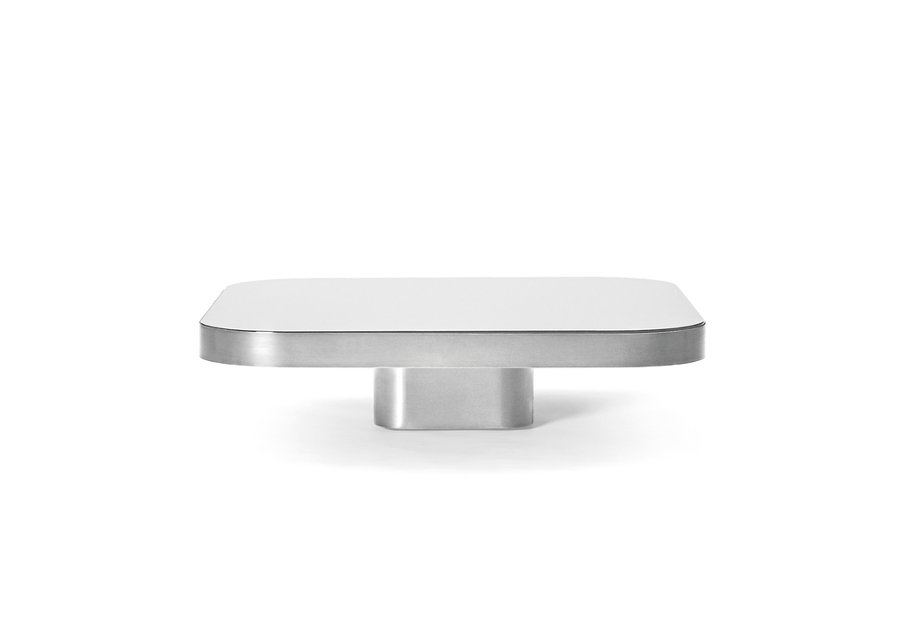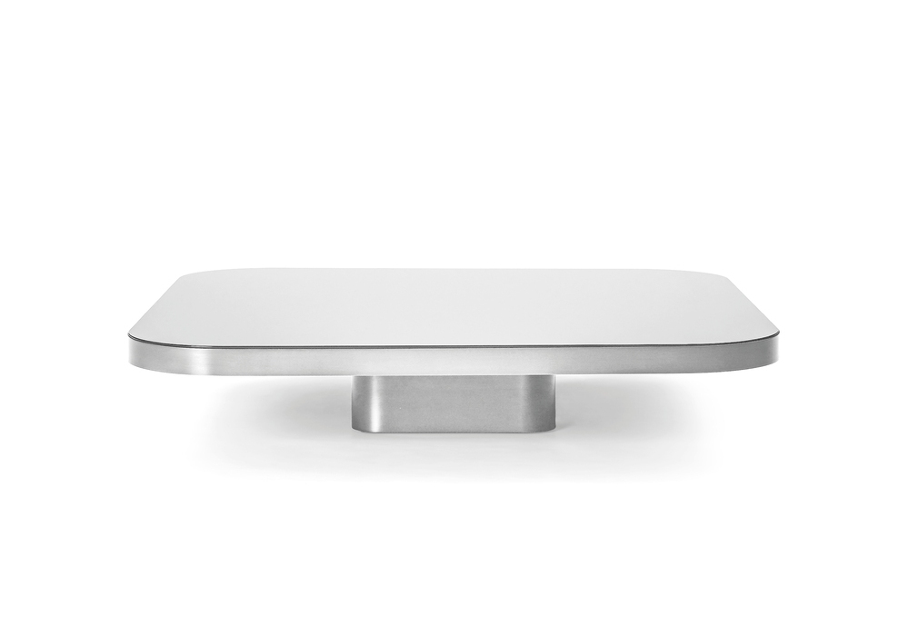 Bow Silver firmato da Guilherme Torres per ClassiCon è un tavolino realizzato in lamiera di alluminio massiccio, verniciato trasparente. Piano in cristallo, con finitura a specchio o laccato nero.
