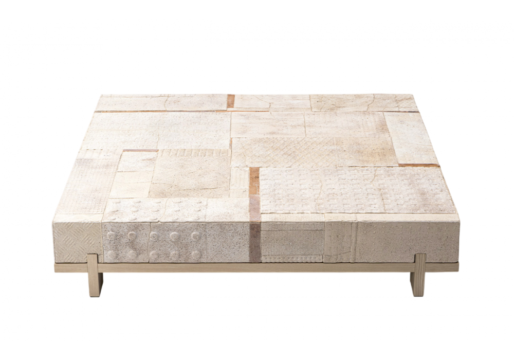 Palinsesto firmato da R. Renzi per Paola Lenti è un tavolino con base e cornice esterna del piano in massello di frassino natuale. Piano in legno multistrato con rivestimento costituito da pannelli in ceramica di diversa dimensione lavorati a mano.