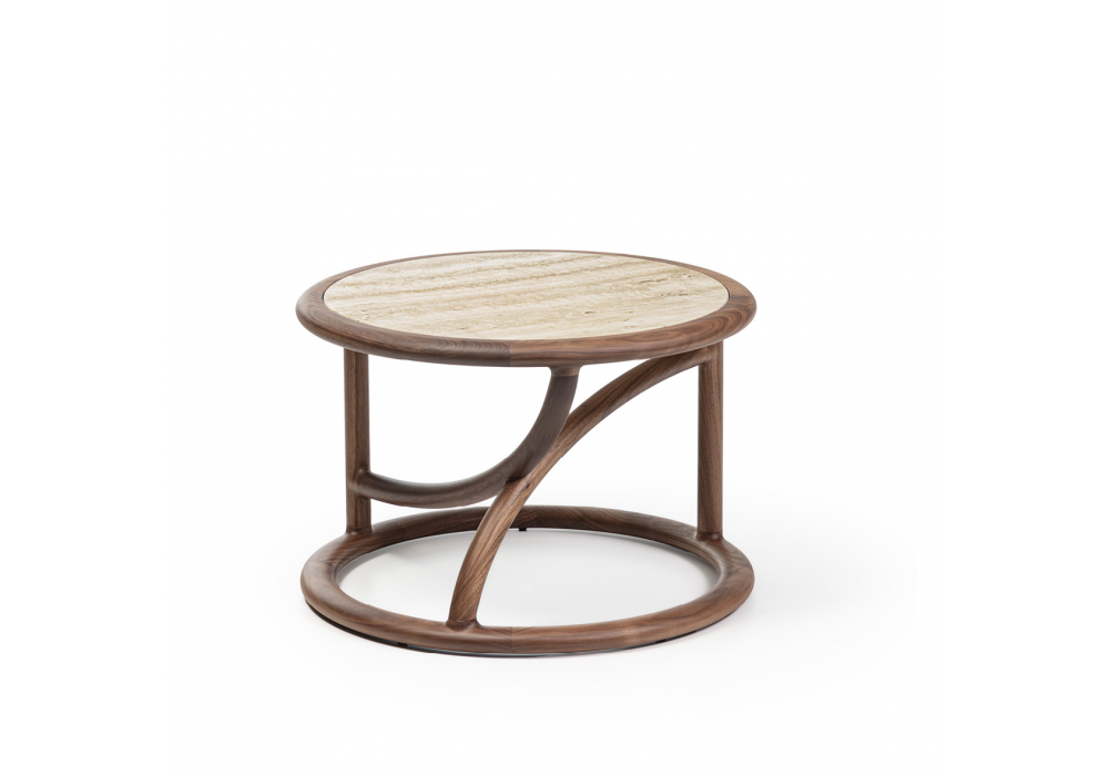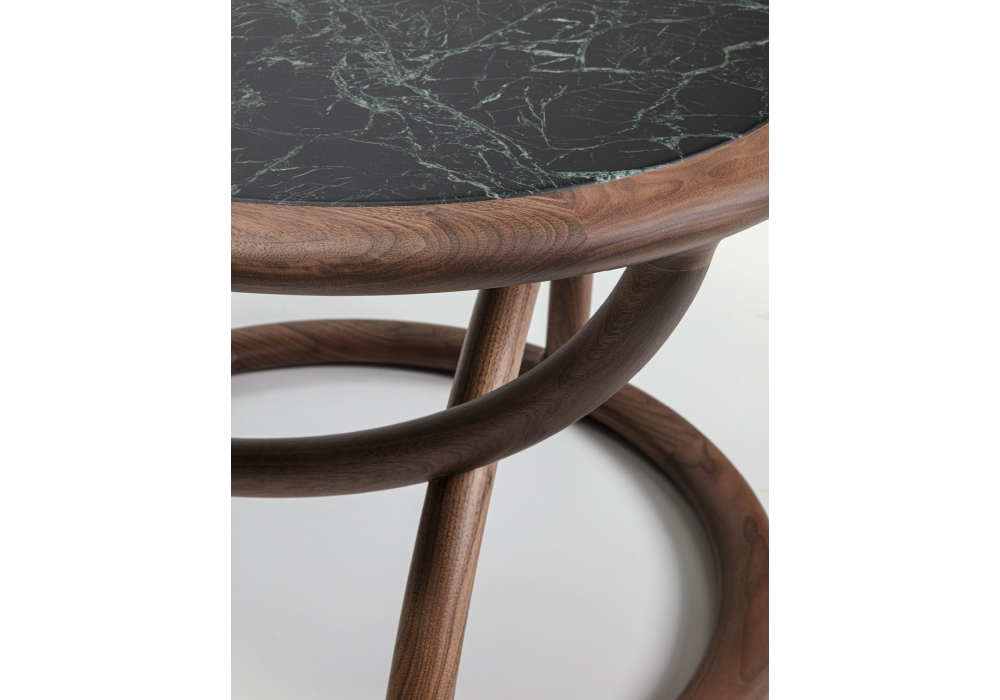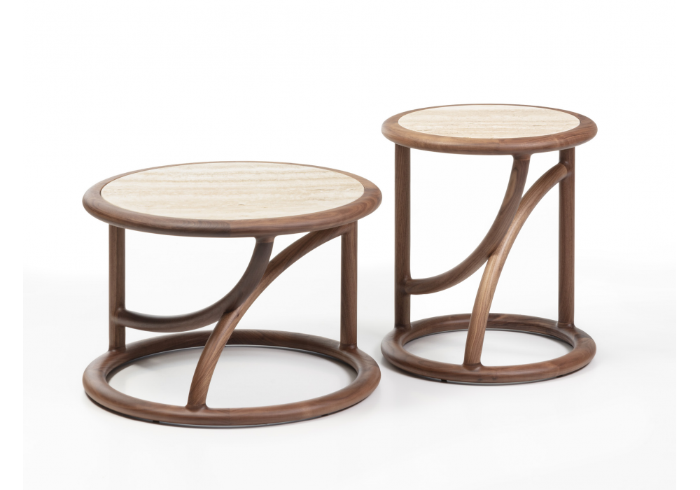 Flip firmato da Andrea Radice per Porada è un tavolino con struttura in massello di noce canaletta e top in marmo oppure cristallo termoformato in finitura Terre.