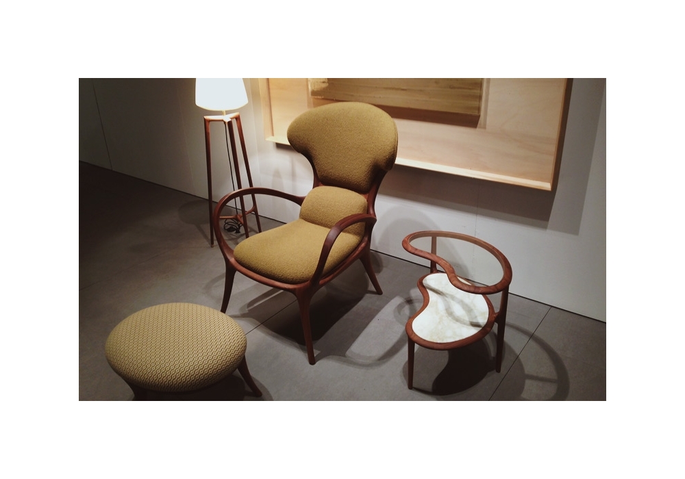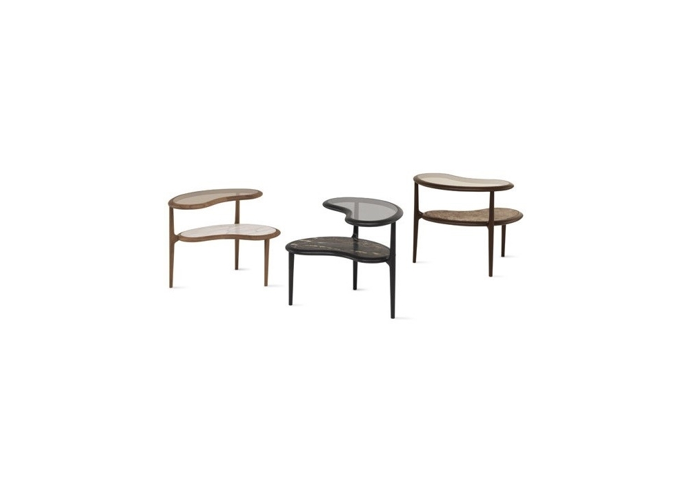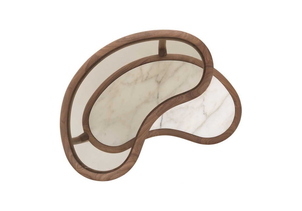 Fagiolo di Ceccotti Collezioni è un tavolino con struttura in legno di noce americano e doppio piano in vetro o marmo disponibile in diverse finiture (marmo, solo nel piano inferiore).