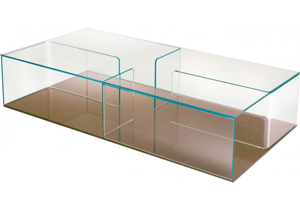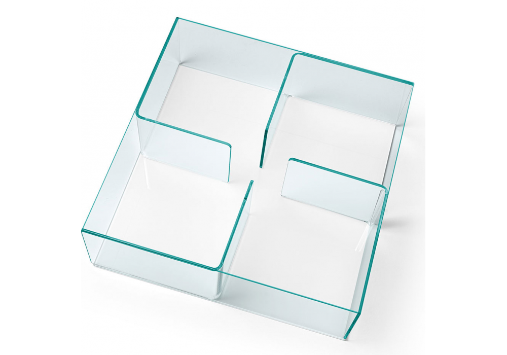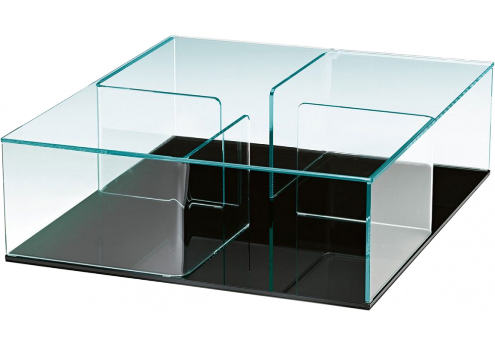 Quadra firmato da Matteo Nunziati per Fiam è un tavolino contenitore composto da 4 elementi in vetro curvato da 10 mm interposti tra 2 piani in vetro da 10 mm. Piano superiore e divisori in vetro extralight trasparente; basi nelle seguenti varianti: vetro extralight trasparente, vetro extralight retroverniciato bianco, vetro extralight retroverniciato nero, vetro extralight retroargentato, vetro bronzo retroargentato.