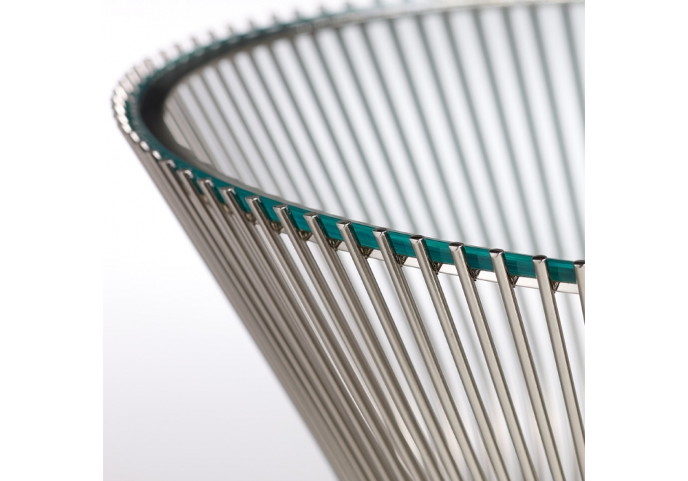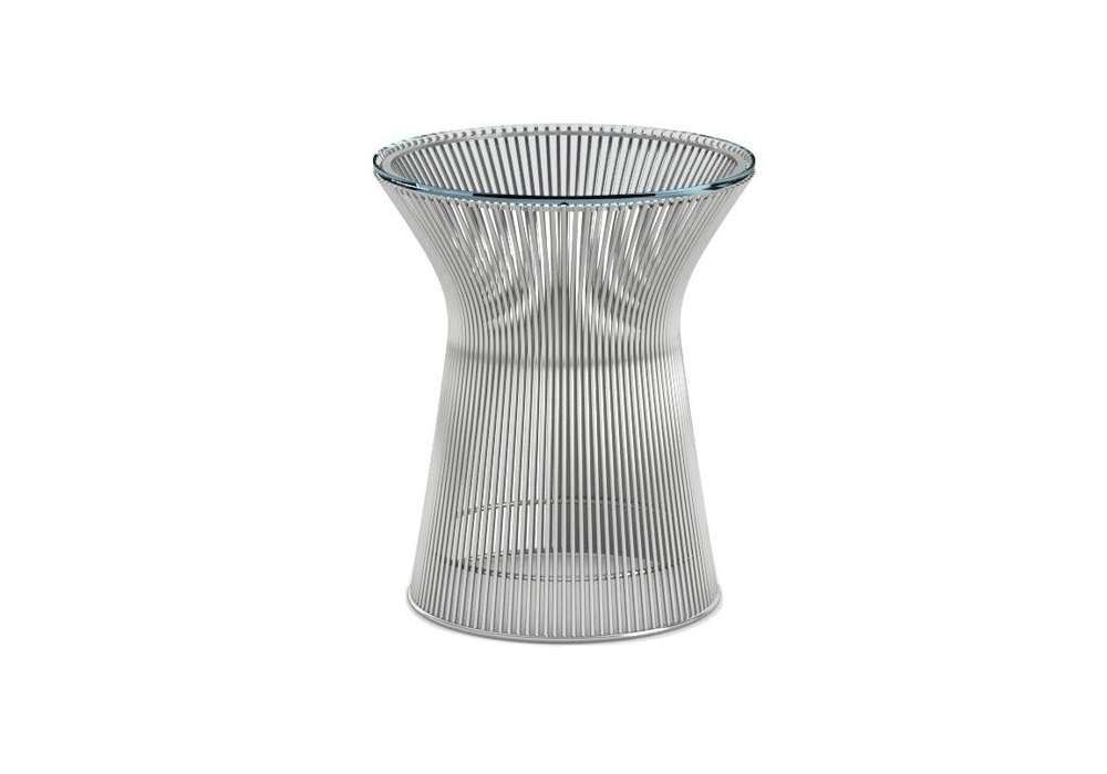 Platner firmato da Warren Platner per Knoll è un tavolino con struttura costituita da tondini metallici sagomati in verticale ed orizzontale, con trattamento di nichelatura e finitura di protezione trasparente, bronzo o oro 18k. Piano in cristallo con bordi smussati o marmo in varie finiture.