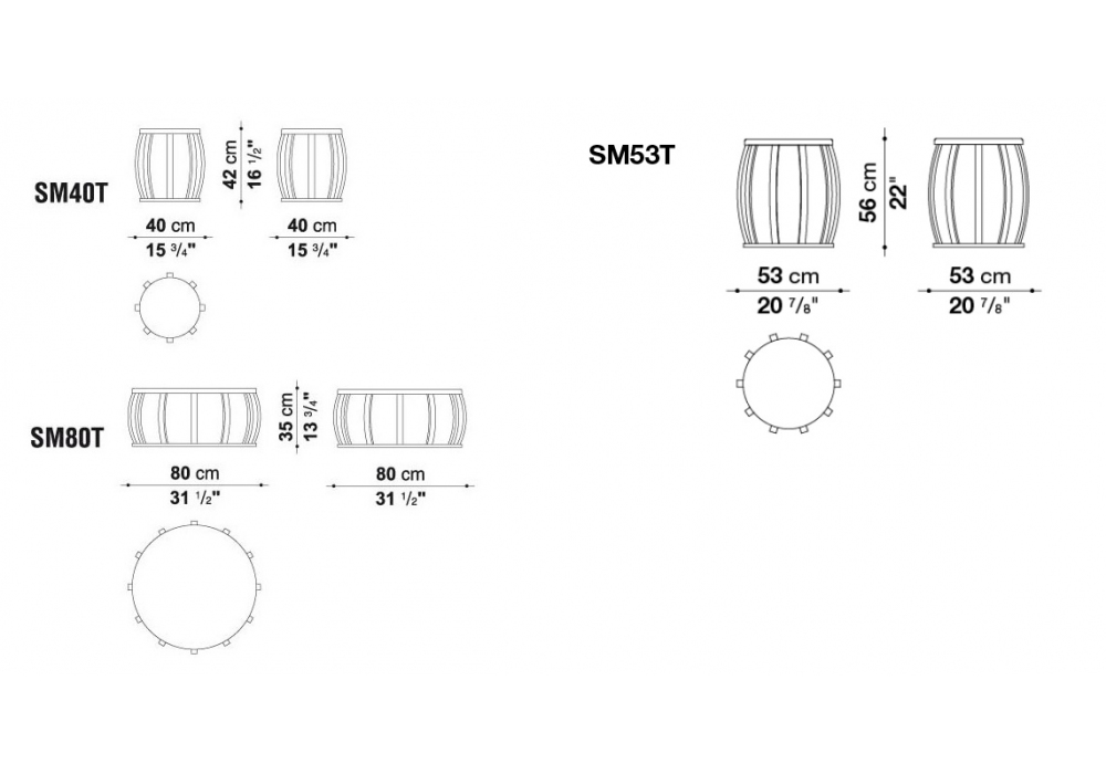 | Dimensioni | Ø 40 x H 42 cm; Ø 80 x H 35 cm; Ø 53 x H 56 cm. |