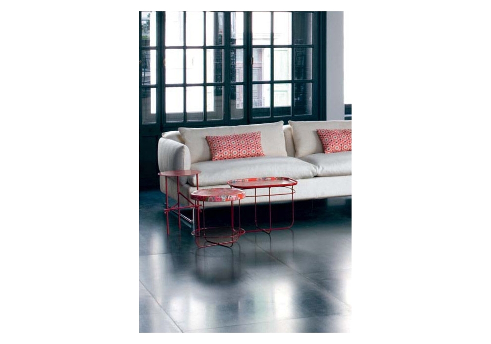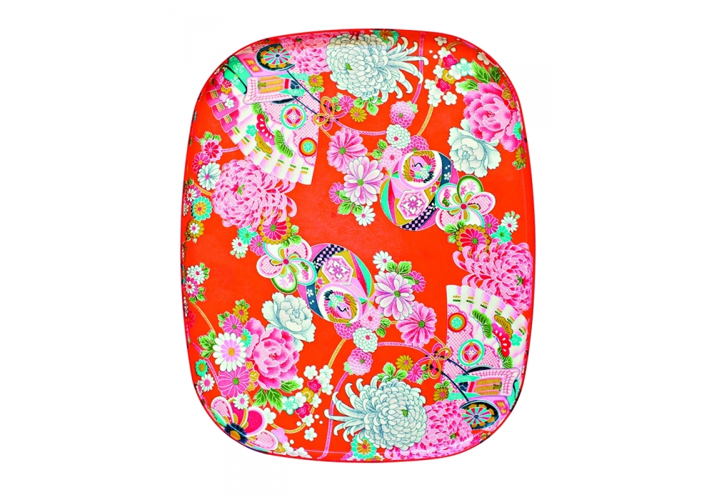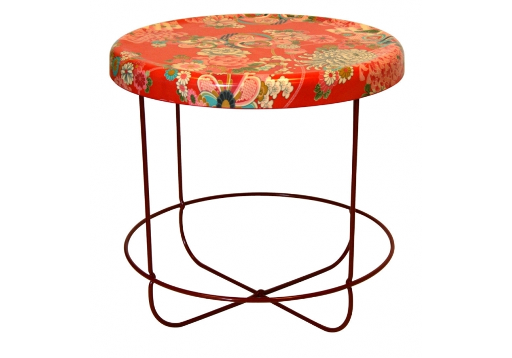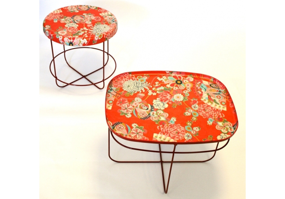 Ukiyo firmato da Tomita Kazuhiko per Moroso è un tavolino d'appoggio con struttura in filo d'acciaio rosso RAL 3003 e piano in tessuto di Kimono tradizionali co-stampato con resina poliestere. La parte inferiore del piano è laccato a mano.