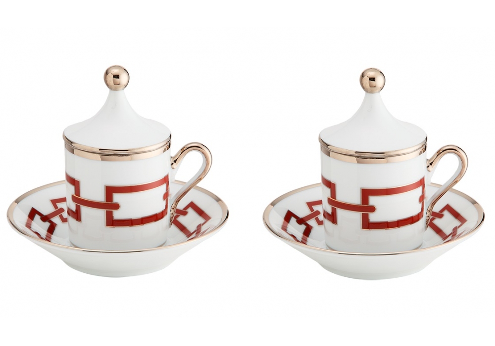 Tazza Caffè con Piatto e Coperchio Catene Scarlatto firmato da Ginori 1735 è un set di 2 tazze da caffè decorate. Con piattino e coperchio.