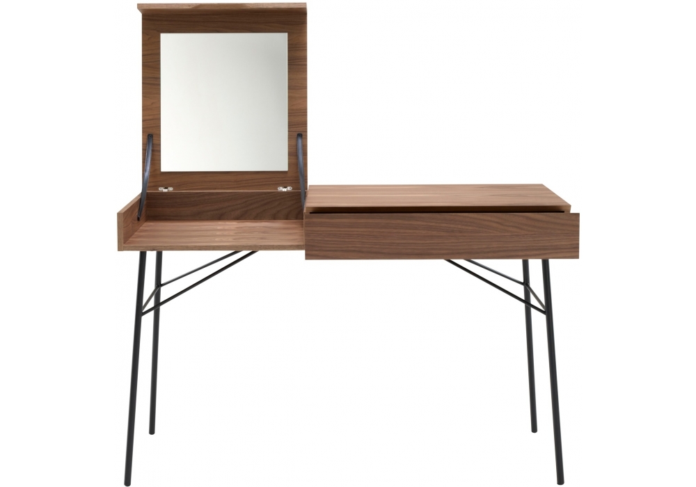 Mobile femminile per eccellenza, la coiffeuse Juliette firmata da Evangelos Vasileiou per Ligne Roset è particolarmente graziosa. Lo spazio coiffeuse presenta un ampio piano di lavoro. E' completato da un cassetto e da un secondo vano contenitore chiuso da un'anta a ribalta. La ribalta nasconde sul lato interno un maxi specchio da utilizzare in posizione aperta. Apertura con 2 molle a gas. L'insieme è realizzato in pannelli in MDF impiallacciato noce biondo americano che conferisce un tocco al contempo prezioso e caldo. La coiffeuse può anche essere utilizzata come scrivania da appartamento. Base in acciaio laccato nero. Dimensioni utili (in cm) del vano contenitore L 48/ P 51,5/ H 8,8 e del cassetto L 63/ P 41,5/ H 5.